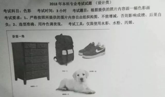 色彩考题:静物组合,卧室一角:抽屉柜一个,背包一个,宠物狗一只,运动鞋一双